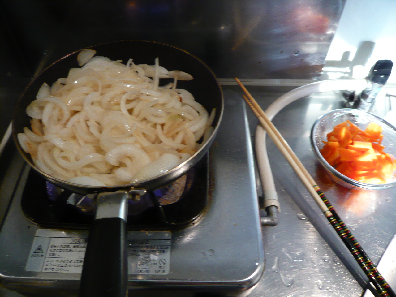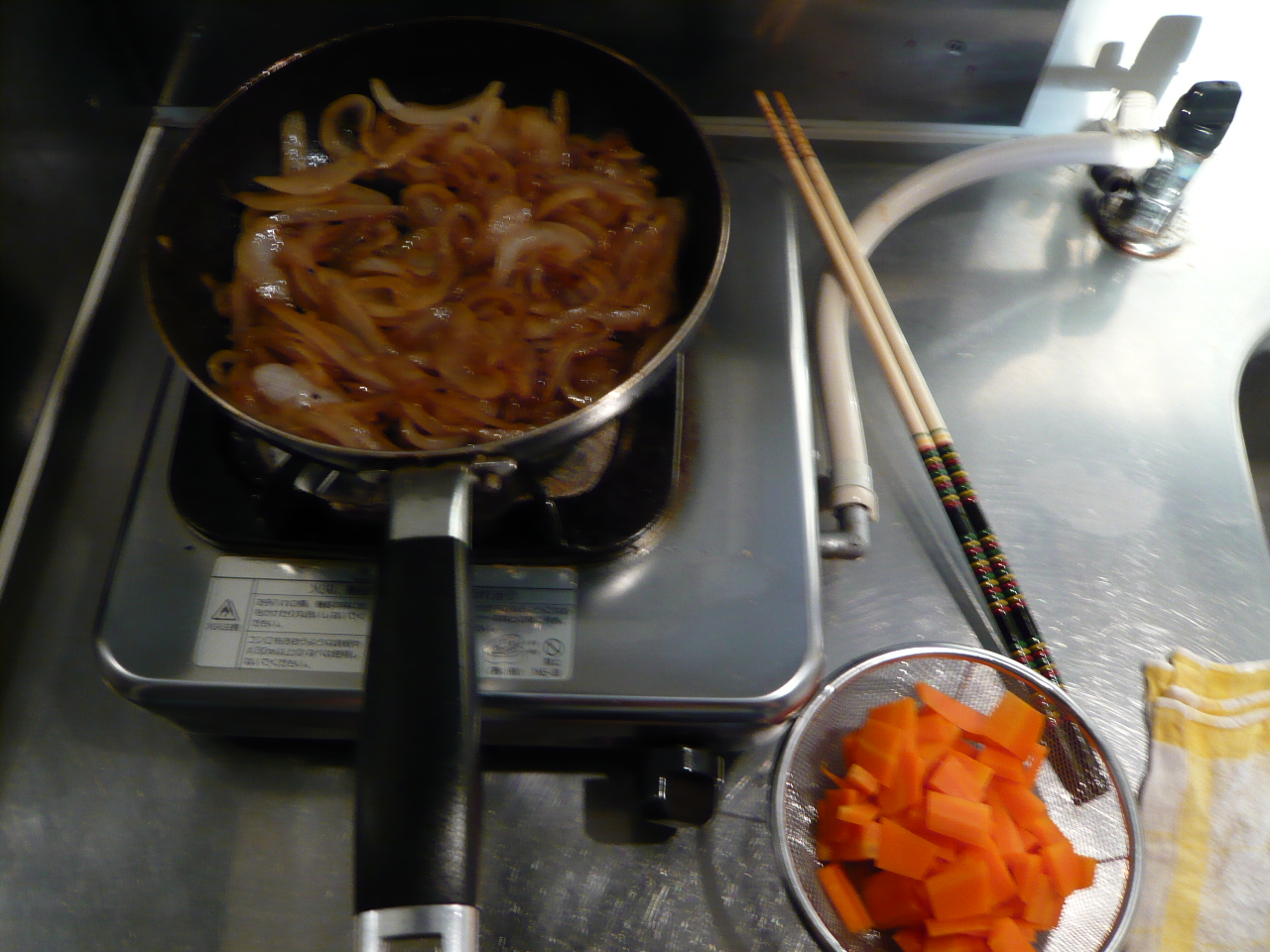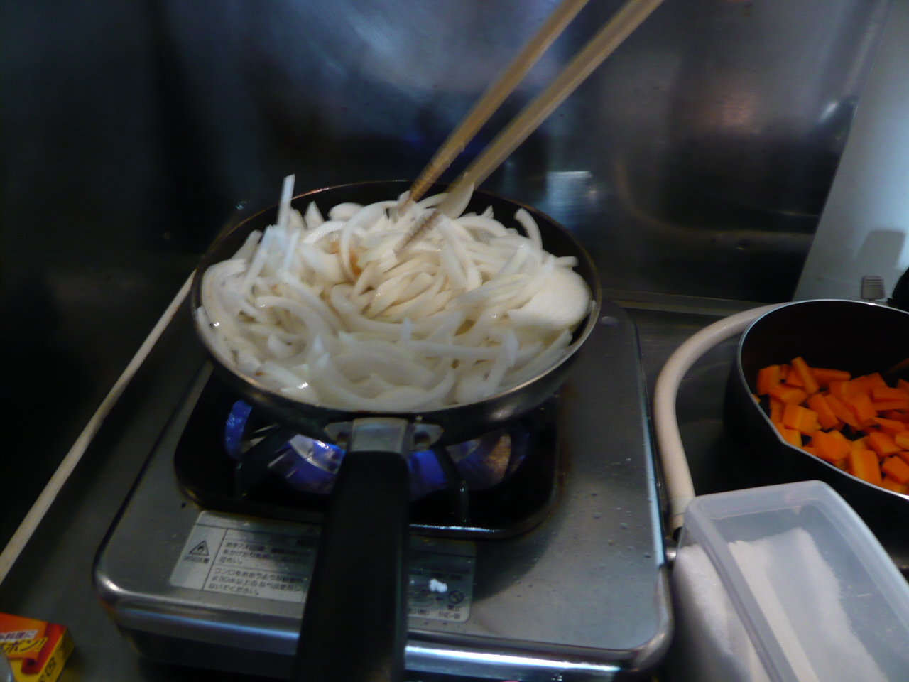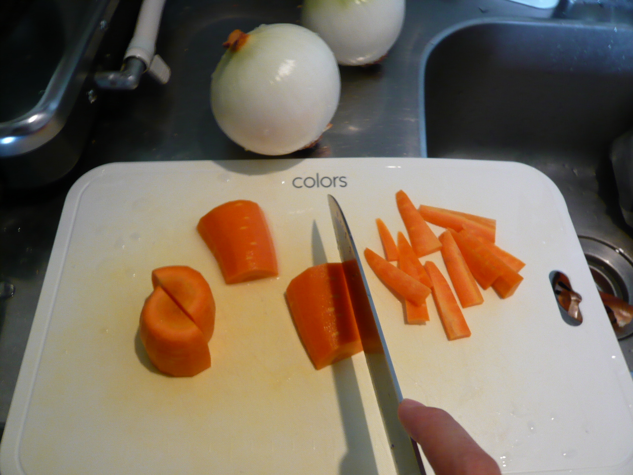 キャス「で、人参を下茹で(先に軽く茹でておく)してる間に玉ねぎ切ります。」