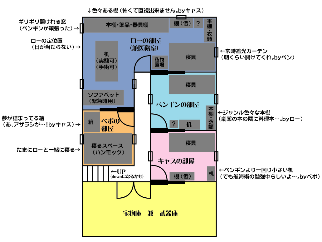 ●ハートの海賊団船室捏造(妄想にもほどがあるよ!)![]() ※キャスの部屋がピンクになってるのはアニメの帽子の色があまりにもショッキングだった為(いの一番にそれを言うのか) ※黒いのは非常用引き戸。ローの私物置場は最低な位置(あるある) ※ローとペンの部屋にある「?」ボックスは叩けばコインやキノコ…じゃなく、ただの武器などの危険物入れ。 それぞれの部屋について、彼らのお喋り・・・覗いてみる?(上から順に読まれるのをオススメします) →キャスケットの部屋について →ペンギンの部屋について →ベポの部屋について →ローの部屋について →番外〜ベポの手品〜 |